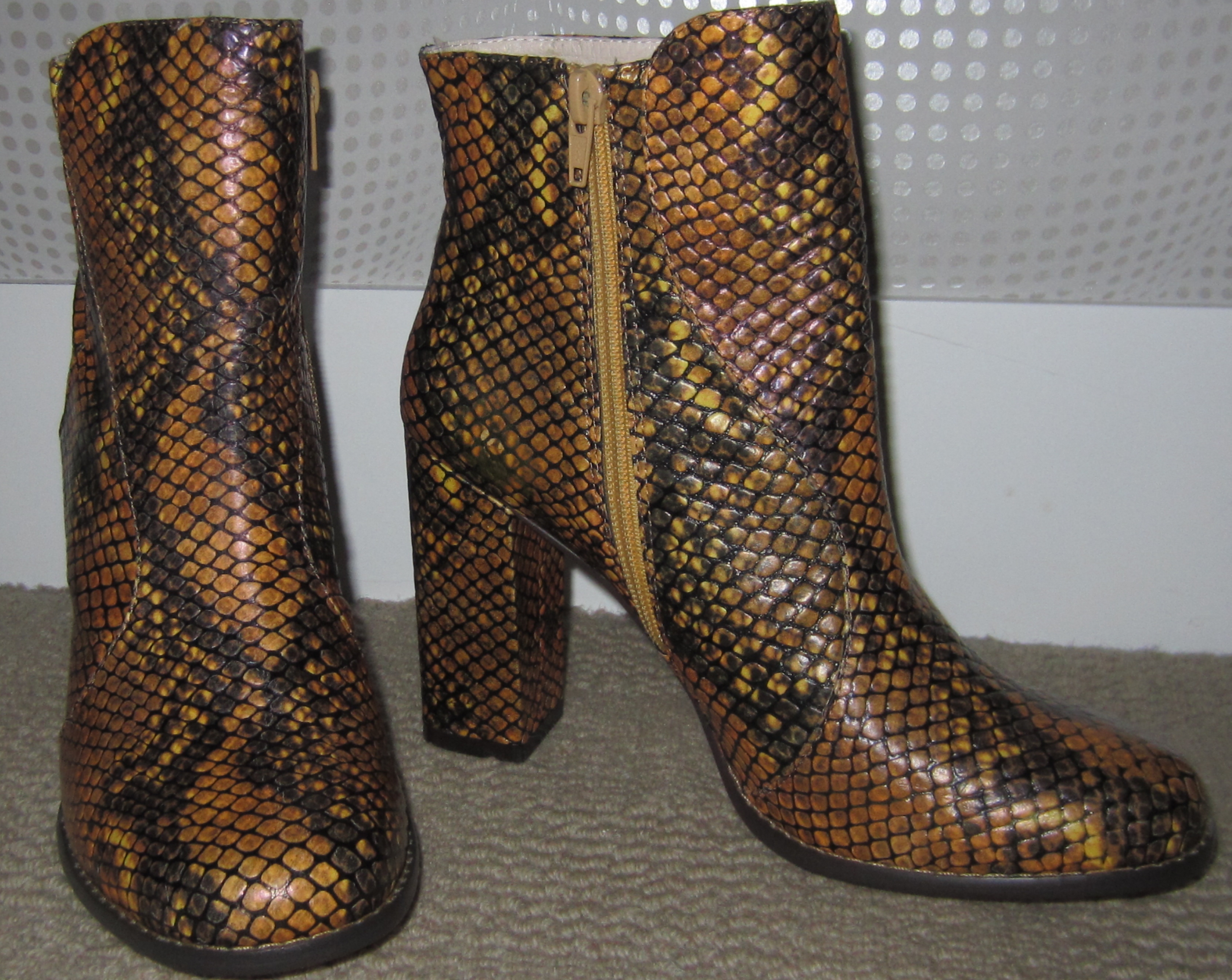I happen to be walking past Mi Piaci in Newmarket and see that all their winter range of boots are on sale, and can’t help but notice that they also have their new range of beautiful spring/summer shoes in store as well. The shop assistant was really helpful and I try on a couple of pairs of black boots, but of course being sale time, there aren’t many sizes left and none that I can squeeze my delicate size 9 foot into. Meanwhile I spy what can only be described as a ‘snake-skin print’ boot (with just a hint of yellow) and decide I might just try those on. They look great and are just the right height and fit perfectly. I instantly know that ‘they are the ones’ I have been looking for.